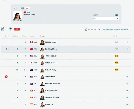 晉級規(guī)則::預賽共26名選手參賽,所有選手進行兩輪滑行,取單輪最佳成績排名,總排名前12名晉級決賽。第2輪預計將于稍后18點35分開始。