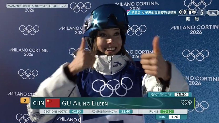 直播吧02月07日訊 米蘭冬奧會自由式滑雪女子坡面障礙技巧預賽,谷愛凌第二輪跳出75.3分暫升自由式滑雪女子坡面障礙技巧預賽第二。