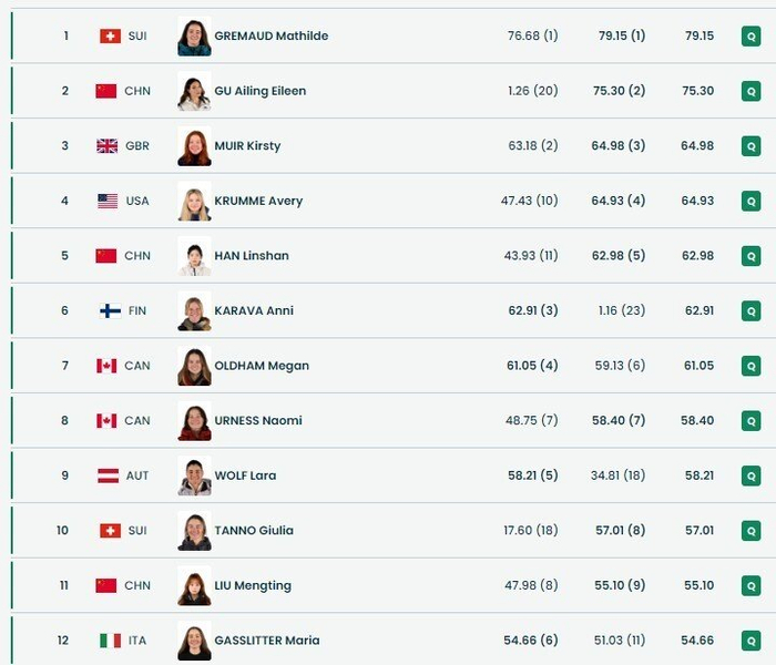 谷愛(ài)凌75.30分的成績(jī)排名預(yù)賽第2位,韓林杉62.98分排名第5位,劉夢(mèng)婷55.10分排名第11位,3位中國(guó)選手?jǐn)y手進(jìn)入決賽。另一位中國(guó)選手楊如意排名第17位,未能進(jìn)入決賽。衛(wèi)冕冠軍瑞士名將格雷莫狼輪分別得到76.68和79.15分,她將是谷愛(ài)凌在決賽最大的競(jìng)爭(zhēng)對(duì)手。
