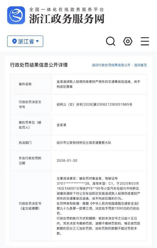 7日下午,記者從浙江政府服務(wù)網(wǎng)站看到,演員金晨被行政處罰,案件名稱為“金某造成致人輕微傷或者財(cái)產(chǎn)損失的交通事故后逃逸,不構(gòu)成犯罪案”,被處罰人為金某某。該處罰決定為1月30日作出,該行政處罰決定書摘要為,2025年03月16日15時(shí)07分金某駕駛滬FE**95號(hào)小型汽車在紹興市柯橋區(qū)湖塘街道嶺下村公交車站附近實(shí)施造成致人輕微傷或者財(cái)產(chǎn)損失的交通事故后逃逸,尚不構(gòu)成犯罪的行為。根據(jù)《中華人民共和國道路交通安全法》第九十九條第一款第三項(xiàng),決定給予罰款1500元的行政處罰。
